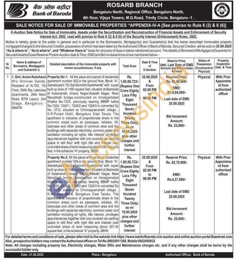 Property No.2: All the piece and parcel of residential apartment number 004, in the ground floor, Block "A", Samaikyaa's "Sn SalSannidhi Apartments with super built up area of 1060 square feet, situated at Backside of Kalamandir, Anand Nagar/ Aswath Nagar. Near Marathalli bridge, constructed on Amalgamated Khatha No.1324, previously bearing BBMP katha No. 1324, 1324/1, 1324/2 and 1324/3 in converted Sy No. 37/2, situated at Chinnappanahalli village K.R.Puram Hobli, Bengaluru East Taluku. The apartment is inclusive of proportionate share in the common areas such as passages, lobbies, lift. starecase and other areas of common area and the buildings with separate electricity, common water and sanitation including all rights, tille interest, privileges appurtenances together with one covered car parking space in stilt floor with right title and interest over undivided share of land measuring about 307.40 square feet, in the schedule "A" property 2BHK