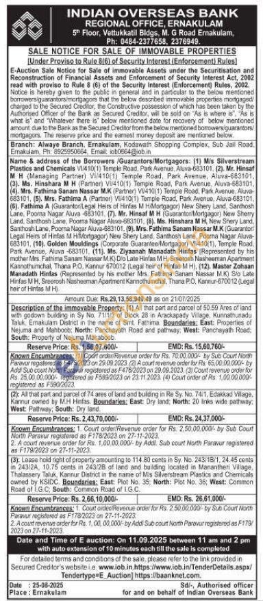 Description of the immovable Property: (1) All that part and parcel of 50.59 Ares of land with godown building in Sy No. 71/1/3 of Block 28 in Arackapady Village, Kunnathunadu Taluk. Ernakulam District in the name of Smt. Fathima. Boundaries; East: Properties of Nejuma and Mahboob: North: Panchayath Road and pathway, West: Panchayath Road, South: Property of Nejuma Mahaboob