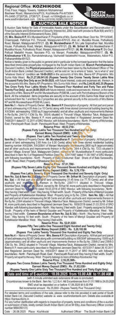 Item No.2: Name of Property Owner: Mr. Muraleedharan P. Description of property: All that part and parcel of land admeasuring 2.60 Ares (le 6.50 Cents) along with three storied residential building bearing number XIII/208A, XIII/208A1 of Manjeri Muncipality admeasuring 2800 sq.ft (approximately) and all other usufructs and improvements thereon in Re-Sy No. 3914 4 (Old Sy. No. 72/2) sluated in Manjen Village, Eranad Taluk, Malappuram District, owned by Mr. Munaleedharan P, more particularly described in item No 5 of Regatered Partition Deed No. 3391/1997 dated 11.09.1997 of SRO Manjen, with following boundaries North Property of Baby Sreekumar East Share of of Bala Saraswathy