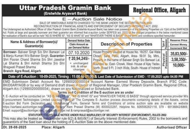 House Property situated at House No. 18/257, Gai Wala Chowk, Sarai Pakki, Aligarh, Area- 59.91 Sq. Mtrs., Property in the name of Balveer Singh Sio Banwari Lal, Bounded as: East- Chowk, West- House of Ajay Yadav, North-Road 9 Ft. 3 Inch Wide, South- House of Indresh Yadav