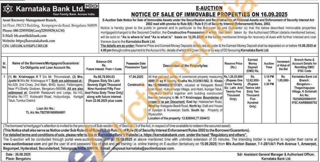 All that part and parcel of commercial property measuring 4890.75 sq ft bearing Khatha No.313/561/562, E- Khata No.152500402200721321, situated at Kelagade Beedi Main Road, Hullyurdurga Village, and Hobil, Kunigal Taluk, Tumakuru District together with building constructed thereon belonging to Mr. HT Krishnappa. Boundaries of property as per Document: East by: Halekacheri Road, West by: Kelagade Beedi Road, North by: Galli and House of Syedjan & Muneerjan Sadik, South by: Property of Riyazuddin.