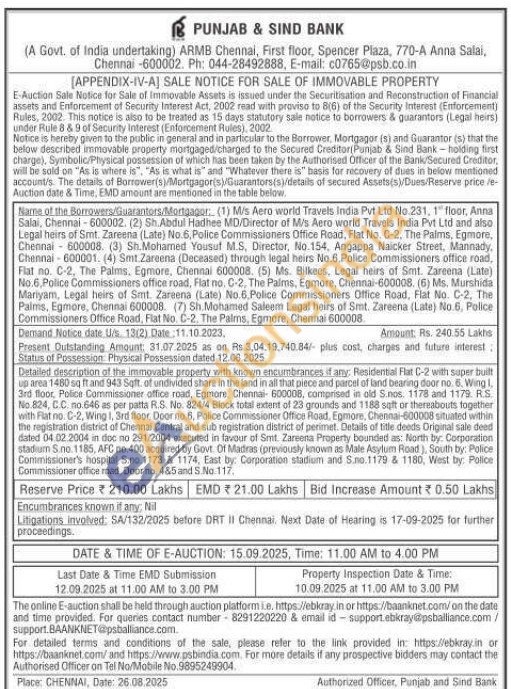 Detailed description of the immovable property with known encumbrances if any. Residential Flat C-2 with super built up area 1480 sq ft and 943 Sqft. of undivided share in the land in all that piece and parcel of land bearing door no. 6. Wing 1, 3rd floor. Police Commissioner office road, Egmore. Chennai 600008, comprised in old S.nos. 1178 and 1179. R.S No.824, С.С. по 646 as per patta R.S. No. 824/4 Block total extent of 23 grounds and 1188 sqft or thereabouts together with Fiat no. C-2, Wing 1, 3rd floor, Door no.6, Police Commissioner Office Road, Egmore, Chennai-600008 situated within the registration district of Chennai Central and sub registration district of perimet. Details of title deeds Original sale deed dated 04.02.2004 in бос по 291/2004 executed in favour of Smt. Zareerta Property bounded as: North by: Corporation stadium S.no. 1185, AFC no.400 acquired by Govt. Of Madras (previously known as Male Asylum Road), South by: Police Commissioner's hospital S.no. 1173 & 1174, East by: Corporation stadium and S.no.1179 & 1180, West by: Police Commissioner office road, Door no. 485 and S.No 117