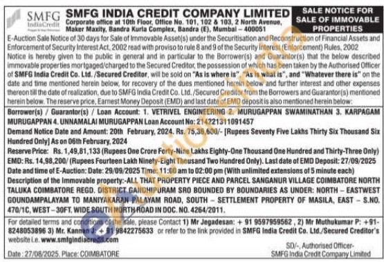 Description of the Immovable property:-ALL THAT PROPERTY PIECE AND PARCEL SANGANUR VILLAGE COIMBATORE NORTH TALUKA COIMBATORE REGD. DISTRICT GANDHIPURAM SRO BOUNDED BY BOUNDARIES AS UNDER: NORTH-EASTWEST GOUNDAMPALAYAM TO MANIYAKARAN PALAYAM ROAD, SOUTH SETTLEMENT PROPERTY OF MASILA, EAST-S.NO. 470/1C, WEST-30FT, WIDE SOUTH NORTH ROAD IN DOC. NO. 4264/2011