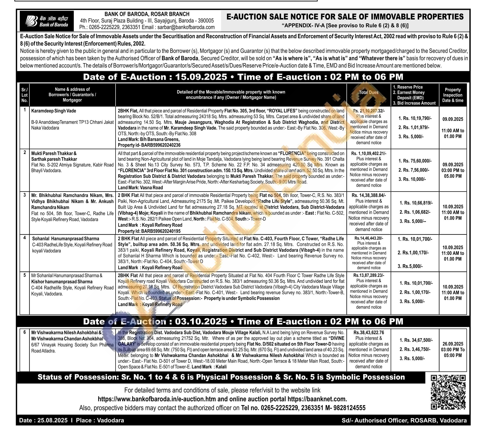 2BHK Flat, All that piece and parcel of Residential Property Flat No. 305, 3rd floor, "ROYAL LIFES" being constructed on land bearing Block No. 52/B/1. Total admeasuring 24318 Sq. Mtrs. admeasuring 53 Sq. Mtrs. Carpet area & undivided share of land admeasuring 14.50 Sq. Mtrs, Mauje Jesangpura, Waghodia At Registration & Sub District Waghodia, and District Vadodara in the name of Mr. Karamdeep Singh Vade. The said property bounded as under:- East:-By Flat No. 306, West:-By OTS, North:-by OTS, South:-By Flat No. 308
