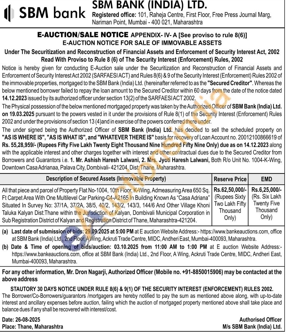 All that piece and parcel of Property Flat No-1004, 10th Floor, K-Wing, Admeasuring Area 650 Sq. Ft Carpet Area With One Multilevel Car Parking-C4-A2165 In Building Known As "Casa Adriana" Situated In Survey No: 37/1A, 37/2A, 38/5, 40/2, 143/2, 143/3, 144/6 And Other Village Khoni Taluka Kalyan Dist:Thane within the Jurisdiction of Kalyan, Dombivali Municipal Corporation in Sub Registration District of Kalyan and Registration District of Thane, Maharashtra-421204