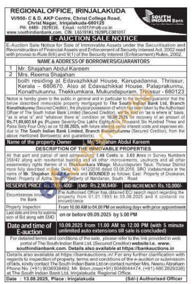 All that part and parcel of land admeasuring 7,48 Cents ie. 3.03 Ares in Survey Numbers 358/42 along with residential building and all other improvements, ssufructs and all other easementary rights therein of in Thekkumkara Village, Makundapuram Taluk. Thrissur District more fully described in Sale Deed No. 1412/2016 dated 03.08.2016 SRO Vadakamkara in the name of Mr. Shajahan Abdul Kareem and BOUNDED as follows; East Property of Divakaran, West. Property of Ajtha, North Property of Nandanan. South Read