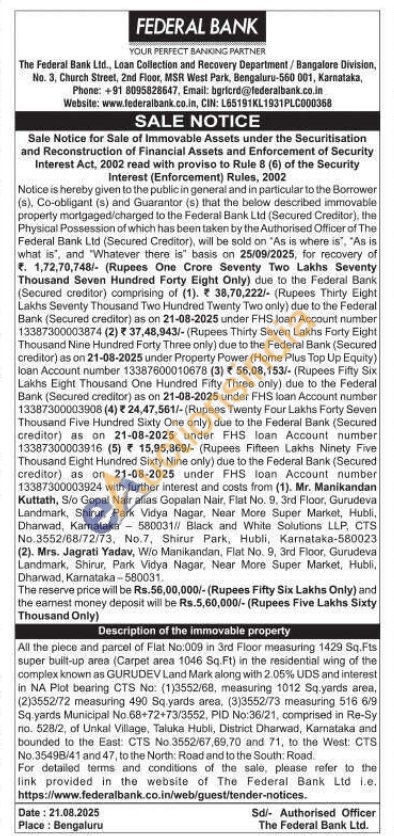 All the piece and parcel of Flat No:009 in 3rd Floor measuring 1429 Sq.Fts super built-up area (Carpet area 1046 Sq.Ft) in the residential wing of the complex known as GURUDEV Land Mark along with 2.05% UDS and interest in NA Plot bearing CTS No: (1)3552/68, measuring 1012 Sq.yards area, (2)3552/72 measuring 490 Sq yards area, (3)3552/73 measuring 516 6/9 Sq yards Municipal No. 68-72+73/3552, PID No:36/21, comprised in Re-Sy no. 528/2, of Unkal Village, Taluka Hubli, District Dharwad, Karnataka and bounded to the East: CTS No. 3552/67,69,70 and 71, to the West: CTS No.35498/41 and 47, to the North: Road and to the South: Road