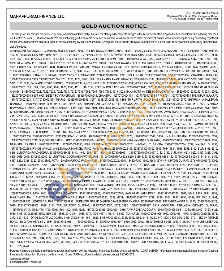 Manappuram Finance Ltd Gold Auctions Auction in Ahmedabad