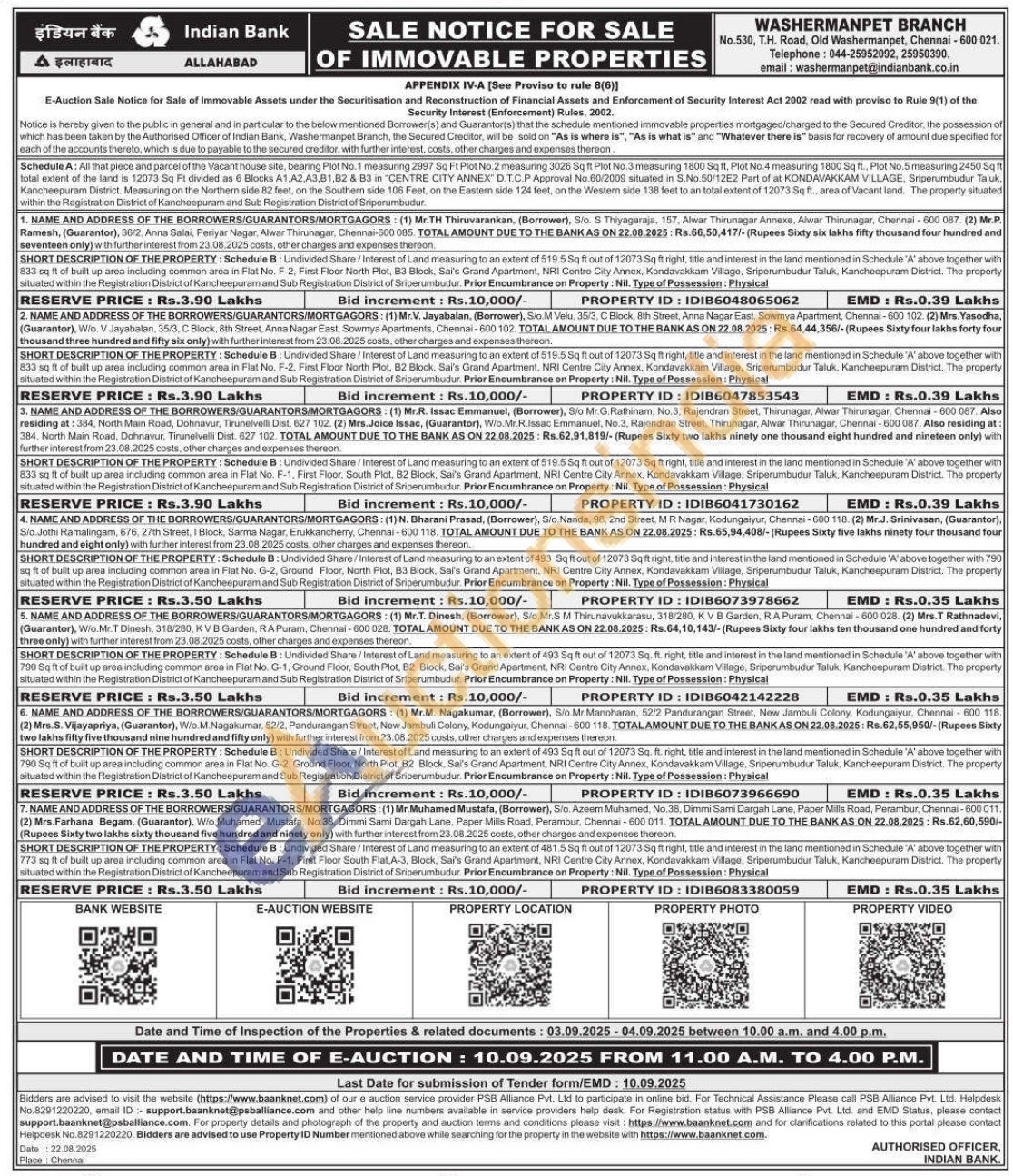 Contact Telephone: 044-25952092, 25950390. email: washermanpet@indianbank.co.in