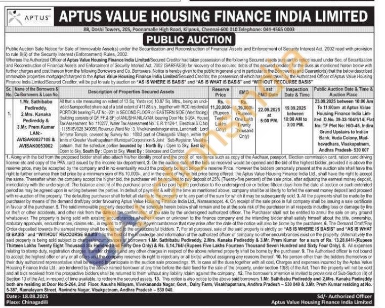 All that a site measuring an endent of 13 Sq. Yards (or) 10.87 Sq. Mtrs, being an und vided Sunspecified share out of a total endent of 411 88 ay, together with RCC residential PORTION bearing FLAT No-201 is SECOND FLOOR on EASTERN SIDE (West facing) building consists of OF FF & SF) ANLISHA NILAYAM, bearing Door No: 5-264, House Tax Assessment No 110277. Water Tax Assessment No ER 11124-1, Electrical SC No 116518V028 349050 Revenue Ward No. 3. Vivekanandanagar anesa, Landmark Lord Srirama Temple, covered by Survey No: 100/3 part of Chinagadi Village, within the Imits of Greater Visakhapatnam Municipal Corporation & Joint Sub-Registrar, Visakha patnam, that the schedule portion bounded by: North By: Open to Sky East By: Open to Sky, South By: Open to Sky, West By: Staircase and Comidor