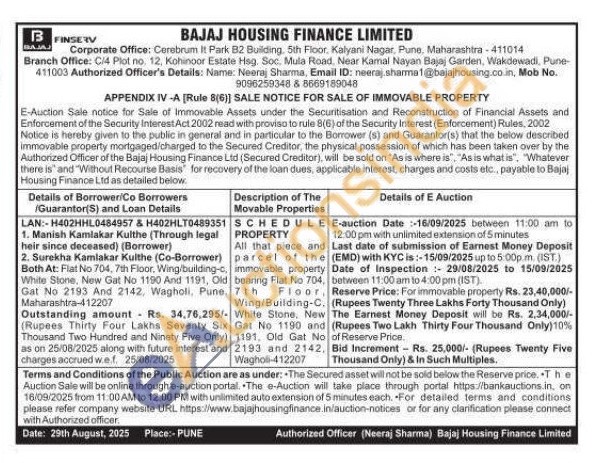 SCHEDULEE-PROPERTY All that piece and parcel of the immovable property bearing Flat No 704, 7th Floor, Wing/Building-C. White Stone, New Gat No 1190 and 1191, Old Gat No 2193 and 2142, Wagholi-412207