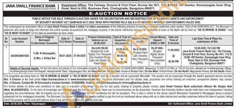 Details of Secured Assets: All that the piece and parcel of the immovable property No.215, E Swathu No. 151200403400120865, Measuring 13.40X10.10 Mts ie 135.34 Sqntrs, situated at Huchhangidurga Village, Huchhangidurga Gram Panchayath, Harapanahalli Taluk, Vijayanagara Dist. and Bounded on: On the East: House of Bhadra Naik, On the West: Hiribai Khana. On the North: Meghyanail Khana, On the South: Road.