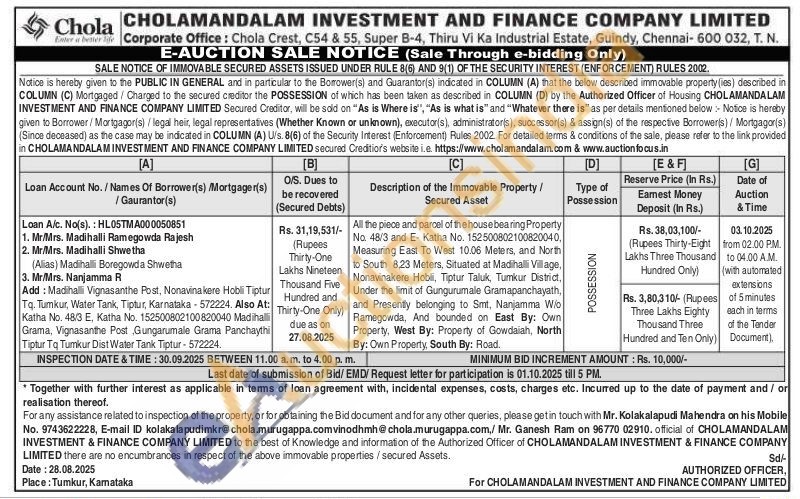 All the piece and parcel of the house bearing Property No. 48/3 and E- Katha No. 152500802100820040, Measuring East To West 10.06 Meters, and North to South 8,23 Meters, Situated at Madihalli Village, Nonavinakere Hobli, Tiptur Taluk, Tumkur District, Under the limit of Gungurumale Gramapanchayath, and Presently belonging to Smt, Nanjamma Wio Ramegowda, And bounded on East By: Own Property, West By: Property of Gowdaiah, North By: Own Property, South By: Road.