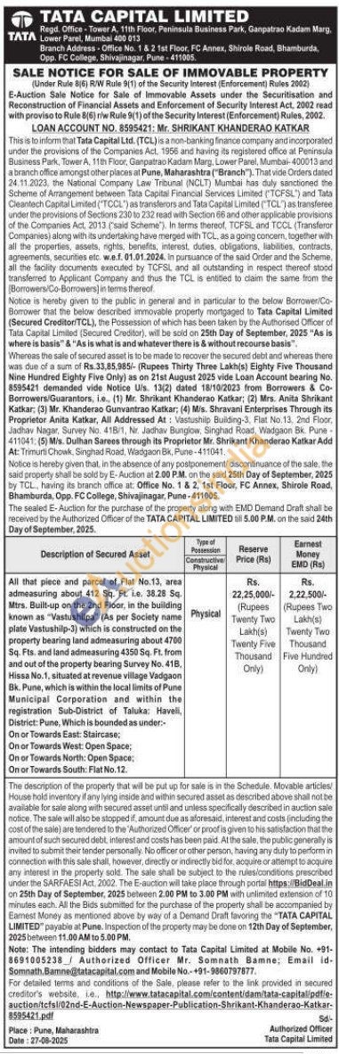 All that piece and parcel of Flat No.13, area admeasuring about 412 Sq. Ft. i.e. 38.28 Sq. Mtrs. Built-up on the 2nd Floor, in the building known as "Vastushilpa" (As per Society name plate Vastushilp-3) which is constructed on the property bearing land admeasuring about 4700 Sq. Fts. and land admeasuring 4350 Sq. Ft. from and out of the property bearing Survey No. 41B, Hissa No.1, situated at revenue village Vadgaon Bk. Pune, which is within the local limits of Pune Municipal Corporation and within the registration Sub-District of Taluka: Haveli, District: Pune, Which is bounded as under:-On or Towards East: Staircase;