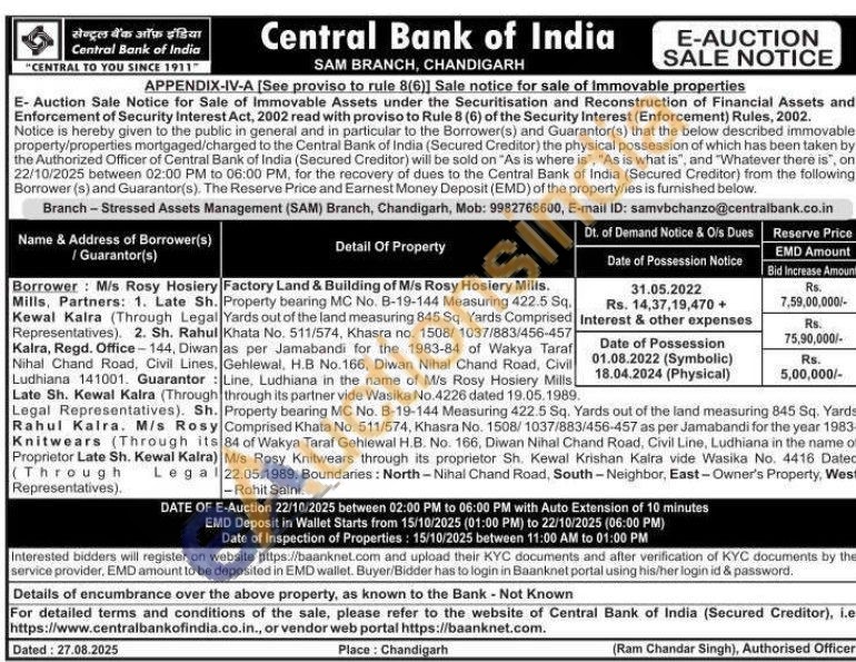 Factory Land & Building of Mis Rosy Hosiery Mills. Property bearing MC No. B-19-144 Measuring 422.5 Sq. Yards out of the land measuring 845 Sq. Yards Comprised Khata No. 511/574, Khasra no. 1508/1037/883/456-457 as per Jamabandi for the 1983-84 of Wakya Taraf Gehlewal, H.B No.166, Diwan Nihal Chand Road, Civil Line, Ludhiana in the name of M/s Rosy Hosiery Mills. through its partner vide Wasika No.4226 dated 19.05.1989. Property bearing MC No. B-19-144 Measuring 422.5 Sq. Yards out of the land measuring 845 Sq. Yards Comprised Khata No. 511/574, Khasra No. 1508/1037/883/456-457 as per Jamabandi for the year 1983-84 of Wakya Taraf Gehlewal H.B. No. 166, Diwan Nihal Chand Road, Civil Line, Ludhiana in the name o M/s Rosy Knitwears through its proprietor Sh. Kewal Krishan Kalra vide Wasika No. 4416 Datec 22.05.1989. Boundaries: North -Nihal Chand Road, South-Neighbor, East-Owner's Property, West -Rohit Saini.