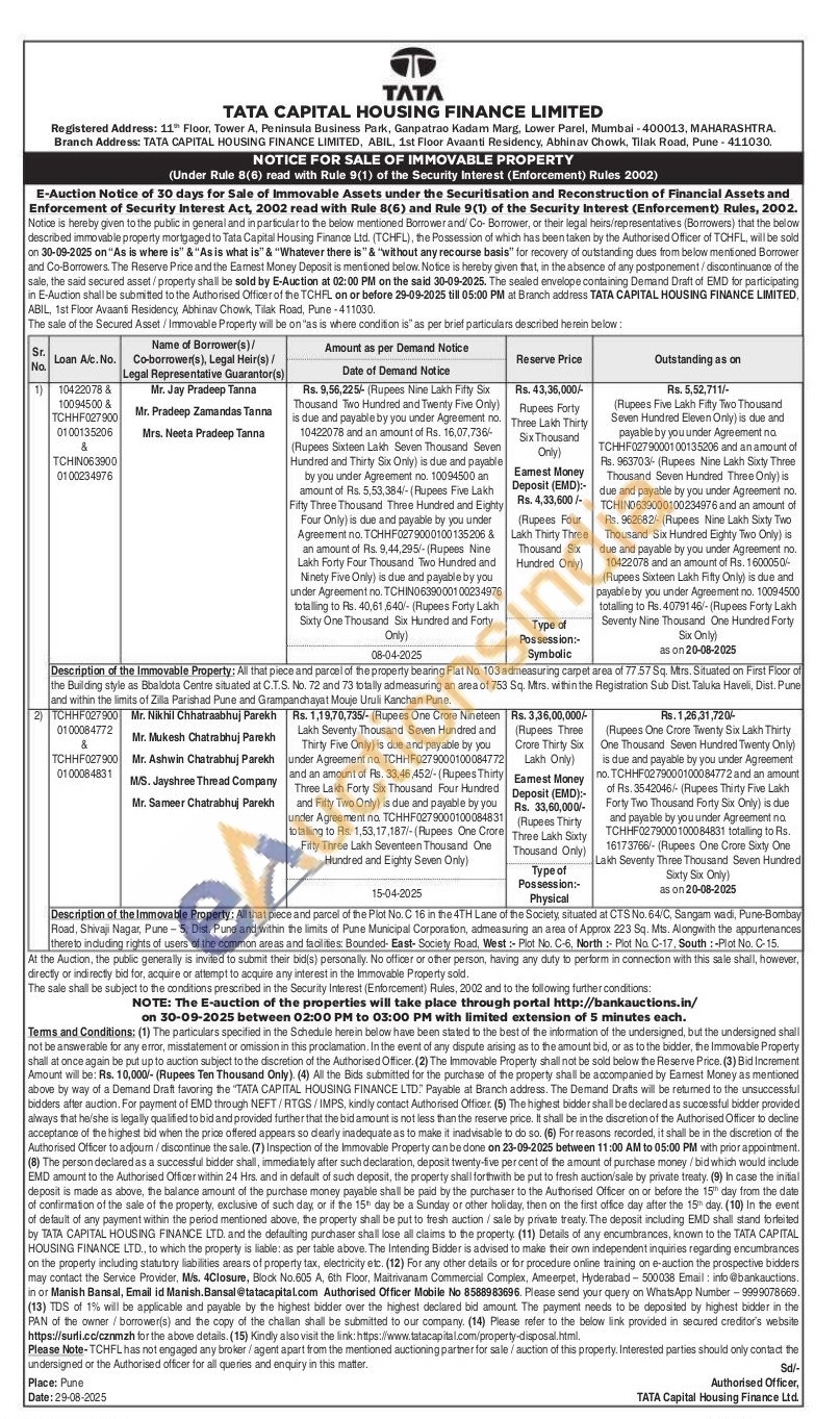 Description of the Immovable Property; All that piece and parcel of the property bearing Flat No. 103 admeasuring carpet area of 77.57 Sq. Mirs. Situated on First Floor of the Building style as Bbaldota Centre situated at C.T.S. No. 72 and 73 totally admeasuring an area of 753 Sq. Mtrs. within the Registration Sub Dist. Taluka Haveli, Dist. Pune and within the limits of Zilla Parishad Pune and Grampanchayat Mouje Uruli Kanchan Pune