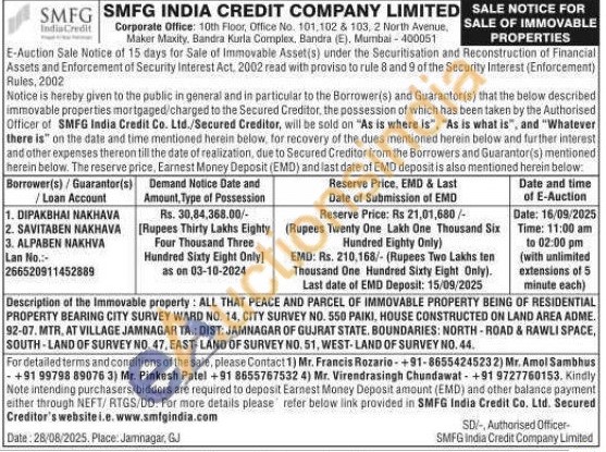 Description of the Immovable property: ALL THAT PEACE AND PARCEL OF IMMOVABLE PROPERTY BEING OF RESIDENTIAL PROPERTY BEARING CITY SURVEY WARD NO. 14, CITY SURVEY NO. 550 PAIKI, HOUSE CONSTRUCTED ON LAND AREA ADME. 92-07. MTR, AT VILLAGE JAMNAGAR TA.: DIST: JAMNAGAR OF GUJRAT STATE. BOUNDARIES: NORTH-ROAD & RAWLI SPACE, SOUTH-LAND OF SURVEY NO. 47, EAST-LAND OF SURVEY NO. 51, WEST-LAND OF SURVEY NO. 44