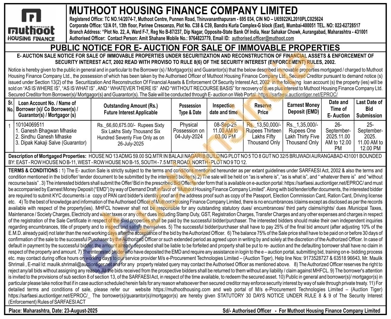 Description of Mortgaged Properties: HOUSE NO 13ADMG 59.00 SQ.MTR IN BALAJI NAGARI B BUILDING PLOT NO 5 TO 8 GUT NO 32/5 BRIJWADI AURANGABAD 431001 BOUNDED BY: EAST-ROW HOUSE NO B-11, WEST-ROW HOUSE NO B-15, SOUTH-7.5 MTR ROAD, NORTH-PLOT NO 9 TO 12
