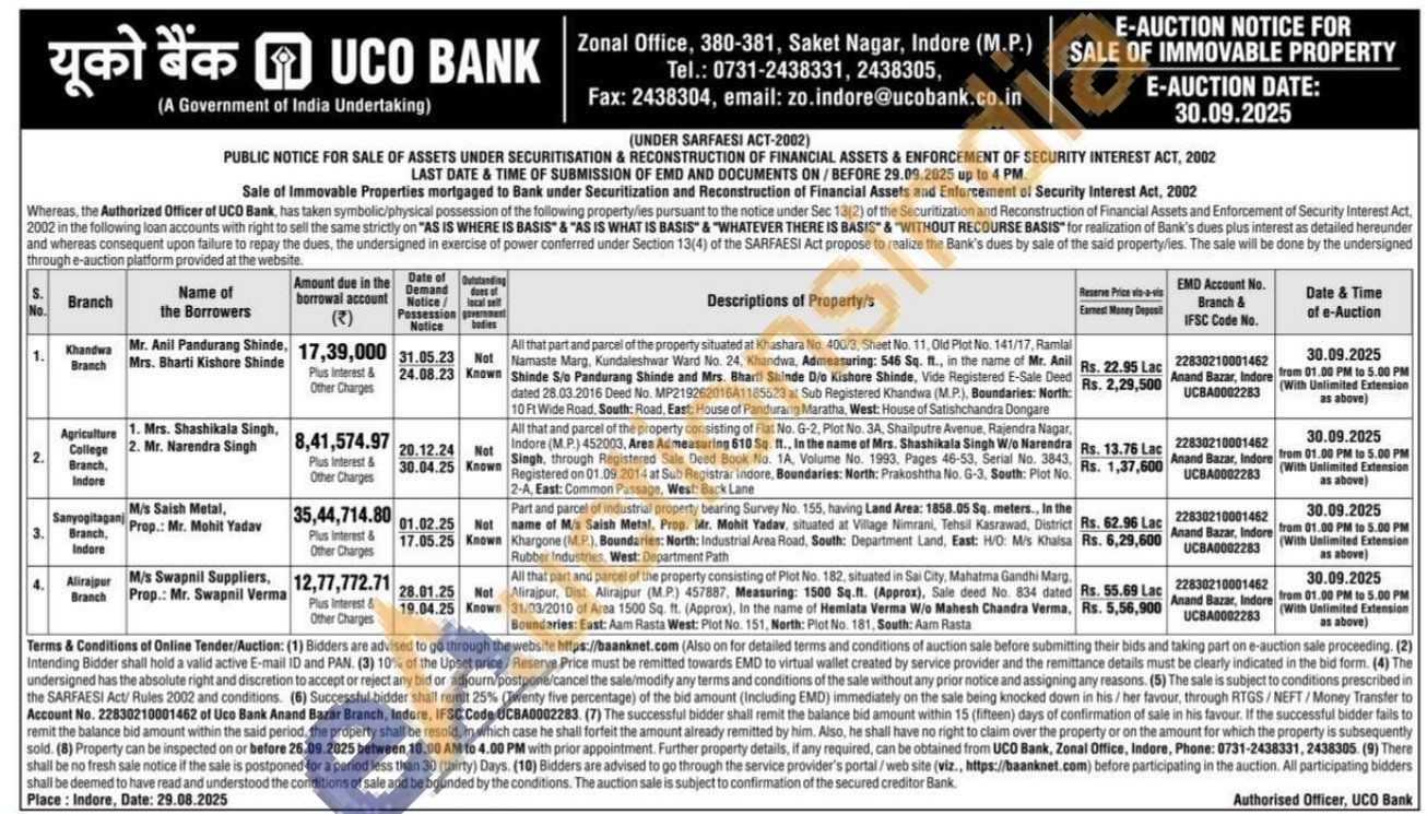 Contact Tel.: 0731-2438331, 2438305, Fax: 2438304, email: zo.indore@ucobank.co.in