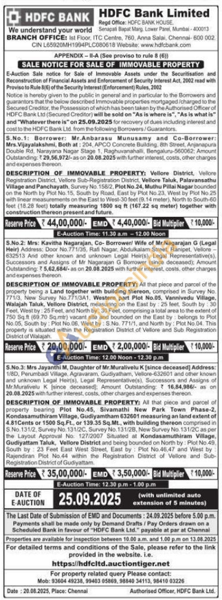 All that piece and parcel of the property being a Land together with building thereon, comprised in Survey No 771/3, New Survey No.771/3A1. Western part Plot No.05, Vannivedu Village. Walajah Taluk, Vellore District, measuring on the East by 25 feet. South by: 30 Feet, West by: 25 Feet, and North by: 30 Feet, comprising a lotal area to the extent of 750 Sqft (69.70 Sqmtr) vacant site and bounded on the East by belongs to Piol No. 05, South by: Plot No.08. West by: S.No. 771/1, and North by: Plot No. 04. This property is situated within the Registration District of Vellore and Sub Registration District of Walajah