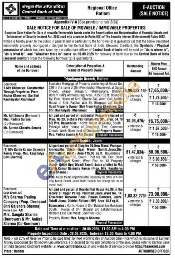 All part and parcel of Shop No 99, New Mandi Prangan. Arniyapitha Krishi Upaj Mandi Samiti, Jaora, Dis trict-Ratlam (M.P.) Area-115.90 sq.ft. Boundaries North: Plot No. 100, South Plot No. 98, East: Open Land of Mandi Samiti, West: Plot No. 61 Property Owner-Krishi Upaj Mandi Samiti, Jaora allotted to Mis Kartik Kumar Gajendra Kumar (Prop. Mrs. Kaushalya Devi Sharma)