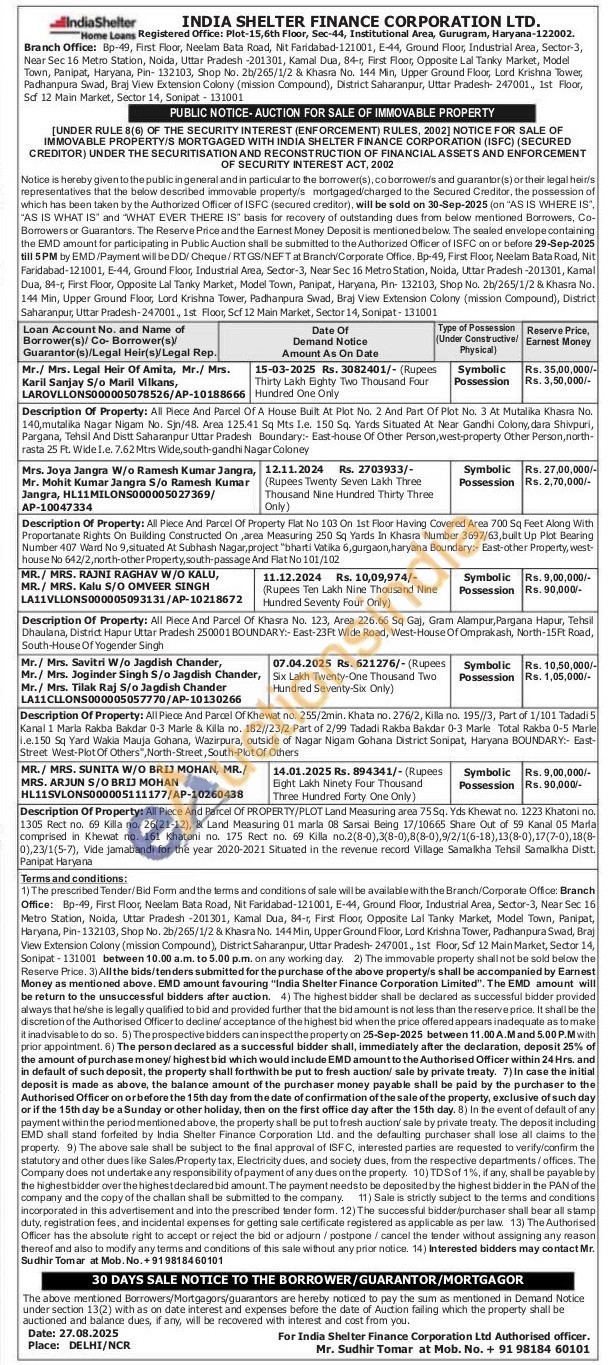Description Of Property: All Piece And Parcel Of A House Built At Plot No. 2 And Part Of Plot No. 3 At Mutalika Khasra No. 140, mutalika Nagar Nigam No. Sjn/48. Area 125.41 Sq Mts I.e. 150 Sq. Yards Situated At Near Gandhi Colony, dara Shivpuri, Pargana, Tehsil And Distt Saharanpur Uttar Pradesh Boundary:- East-house Of Other Person, west-property Other Person, north-rasta 25 Ft. Wide I.e. 7.62 Mtrs Wide, south-gandhi Nagar Coloney