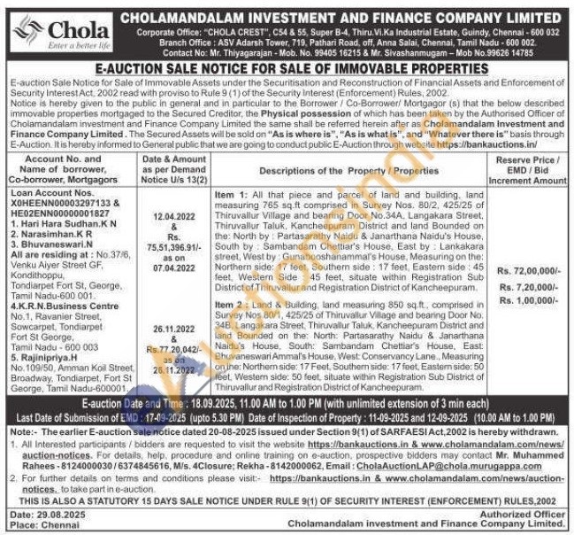 Item 1: All that piece and parcel of land and building, land measuring 765 sq.ft comprised in Survey Nos. 80/2, 425/25 of Thiruvallur Village and bearing Door No.34A, Langakara Street, Thiruvallur Taluk, Kancheepuram District and land Bounded on the: North by Partasarathy Naidu & Janarthana Naidu's House, South by Sambandam Chettiar's House, East by Lankakara street, West by Gunabooshanammal's House, Measuring on the: Northern side: 17 feet, Southern side: 17 feet, Eastern side: 45 feet, Western Side 45 feet, situate within Registration Sub District of Thiruvallur and Registration District of Kancheepuram. Item 2: Land & Building, land measuring 850 sq.ft., comprised in Survey Nos. 80/1, 425/25 of Thiruvallur Village and bearing Door No. 348, Langakara Street, Thiruvallur Taluk, Kancheepuram District and land Bounded on the North: Partasarathy Naidu & Janarthana Naidu's House, South: Sambandam Chettiar's House, East Bhuvaneswari Ammal's House, West: Conservancy Lane., Measuring on the: Northern side: 17 Feet, Southem side: 17 feet, Eastem side: 50 feet, Western side: 50 feet, situate within Registration Sub District of Thiruvallur and Registration District of Kancheepuram