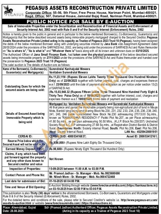 All that piece and parcel the immovable property being non-agricultural plot of land in Mauje Mota, Bardoli lying being land bearing Block No.230, 231, 232, 233, 234, 235, 236, 238, 240, 241, 245, 246 paikki consolidated New Block No.230 admeasuring 27013.00 Sq.mtrs... known as "RAMKRISHNA RESIDENCY-1" Paikki Plot No.207, as per Place admeasuring 41.80 Sq.mtrs., as per plan admeasuring 50.50 Mtrs., (K.J.P. Block No.230/207) Undivided Society Road & C.O.P admeasuring 27.68 Sq.mtrs., at Registration District Bardoli & District Surat. Boundaries: North: Society internal Road, South: Plot No.206, East: Plot No.208. West: Society Internal Road.