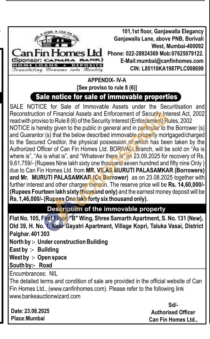 Flat No. 105, First Floor, "B" Wing, Shree Samarth Apartment, S. No. 131 (New), Old 39, H. No. 1, Near Gayatri Apartment, Village Kopri, Taluka Vasai, District Palghar. 401 303 North by:- Under construction Building East by: Building Westby: Open space South by:- Road