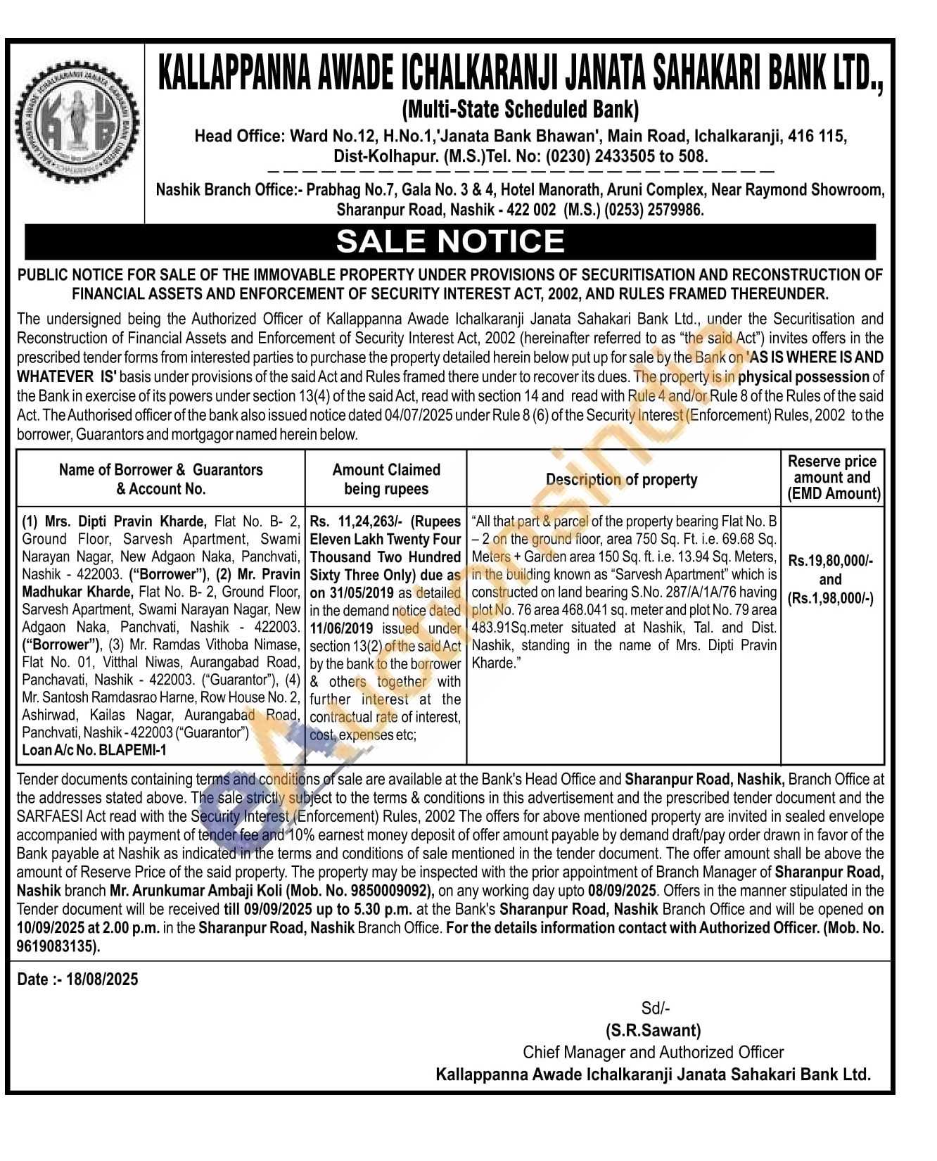"All that part & parcel of the property bearing Flat No. B 2 on the ground floor, area 750 Sq. Ft. i.e. 69.68 Sq. Meters + Garden area 150 Sq. ft. i.e. 13.94 Sq. Meters, in the building known as "Sarvesh Apartment" which is constructed on land bearing S.No. 287/A/1A/76 having plot No. 76 area 468.041 sq. meter and plot No. 79 area 483.91Sq.meter situated at Nashik, Tal. and Dist. Nashik, standing in the name of Mrs. Dipti Pravin Kharde."