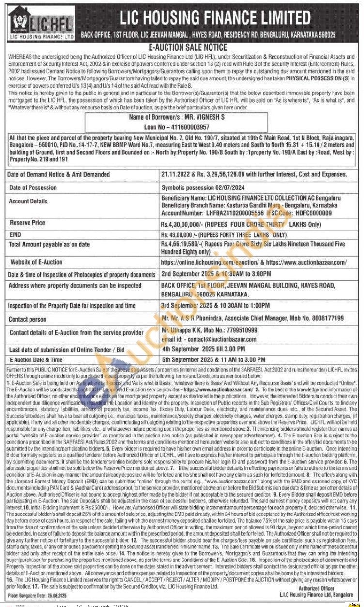 All that the piece and parcel of the property bearing New Municipal No. 7, Old No. 190/7, situated at 19th C Main Road, 1st N Block, Rajajinagara, Bangalore-560010, PID No. 14-17-7, NEW BBMP Ward No.7, measuring East to West 9.40 meters and South to North 15.31 +15.10/2 meters and building of Ground, first and Second Floors and Bounded on:- North by: Property No. 190/8 South by : Tproperty No. 190/A East by :Road, West by: Property No. 219 and 191