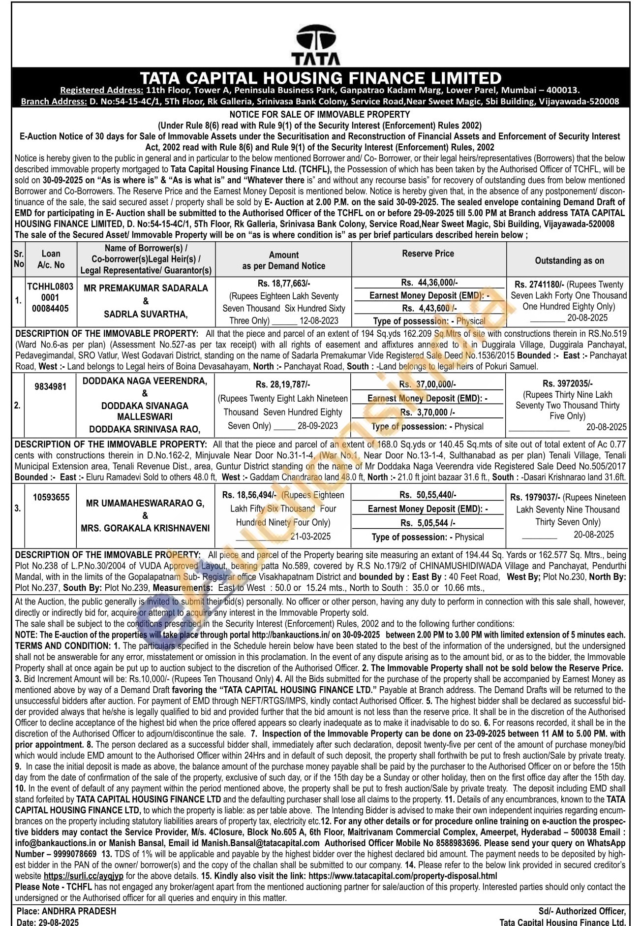 DESCRIPTION OF THE IMMOVABLE PROPERTY: All that the piece and parcel of an extent of 194 Sq.yds 162.209 Sq.Mtrs of site with constructions therein in RS.No.519 (Ward No.6-as per plan) (Assessment No.527-as per tax receipt) with all rights of easement and affixtures annexed to it in Duggirala Village, Duggirala Panchayat, Pedavegimandal, SRO Vatlur, West Godavari District, standing on the name of Sadaria Premakumar Vide Registered Sale Deed No. 1536/2015 Bounded: East: Panchayat Road, West: Land belongs to Legal heirs of Boina Devasahayam, North: Panchayat Road, South: -Land belongs to legal heirs of Pokuri Samuel.