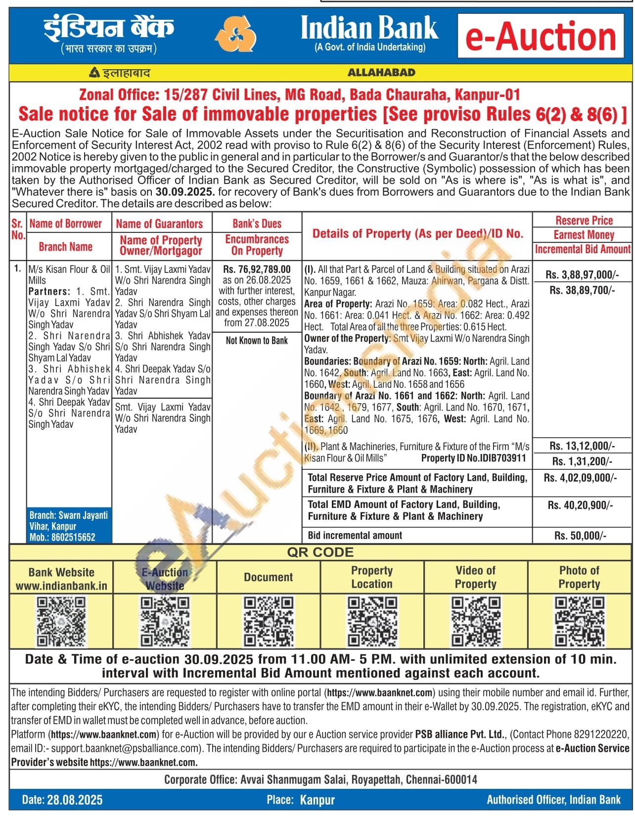 (1). All that Part & Parcel of Land & Building situated on Arazi No. 1659, 1661 & 1662, Mauza: Ahirwan, Pargana & Distt. Kanpur Nagar.Area of Property: Arazi No. 1659: Area: 0.082 Hect., Arazi No. 1661: Area: 0.041 Hect. & Arazi No. 1662: Area: 0.492 Hect. Total Area of all the three Properties: 0.615 Hect.Owner of the Property: Smt Vijay Laxmi W/o Narendra Singh Yadav,Boundaries: Boundary of Arazi No. 1659: North: Agril. Land No. 1642, South: Agril. Land No. 1663, East: Agril. Land No. 1660, West: Agril. Land No. 1658 and 1656Boundary of Arazi No. 1661 and 1662: North: Agril. Land No. 1642, 1679, 1677, South: Agrii. Land No. 1670, 1671, East: Agril. Land No. 1675, 1676, West: Agril. Land No. 1669, 1660