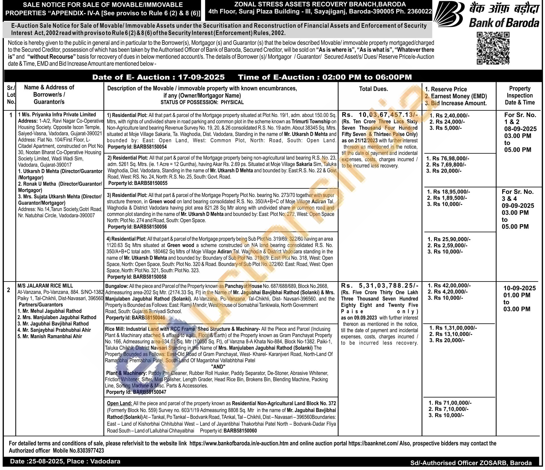 All the piece and parcel of the property known as Residential Non-Agricultural Land Block No. 372 (Formerly Block No. 559) Survey no. 603/1/19 Admeasuring 8808 Sq. Mtr in the name of Mr. Jagubhai Bavjibhai Rathod (Solanki) Al-Tankal, Po Tankal-Bodvank Road, TAnkal, Tal-Chikhli, Dist-Navasari-396560Boundaries: East-Land of Kishorbhai Chhitubhai West Land of Jayantibhai Thakorbhai Patel North Bodvank-Dadar Fliya Road South-Land of Lallubhai Chhayalbhai Property id: BARB58150060Plant & Machinery: Paddy Pre Cleaner, Rubber Roll Husker, Paddy Separator, De-Stoner, Abrasive Whitener, Friction Whitener, Sifter, Mist Polisher, Length Grader, Head Rice Bin, Brokens Bin, Blending Machine, Packing Line, Sorting Machine & Misc. Parts & Accessories. Porperty Id: BARB58150047