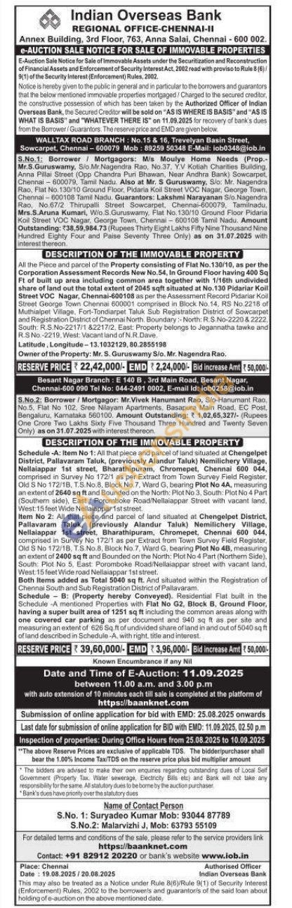 Schedule -A: Item No 1: All that plece and parcel of land situated at Chengelpet District, Pallavaram Taluk, (previously Alandur Taluk) Nemilichery Village, Nellaiappar 1st street, Bharathipuram, Chromepet, Chennai 600 044, comprised in Survey No 172/1 as per Extract from Town Survey Field Register, Old S No 172/18, T.S. No.8, Block No.7, Ward G, bearing Plot No 4A, measuring an extent of 2640 sq ft and Bounded on the North: Plot No 3, South: Plot No 4 Part (Southem side), East: Poromboke Road/Nellaiappar Street with vacant land, West: 15 feet Wide Nellalappar 1st street Item No 2: All that piece and parcel of land situated at Chengelpet District, Pallavaram Taluk, (previously Alandur Taluk) Nemilichery Village, Nellalappar 1st street, Bharathipuram, Chromepet, Chennai 600 044, comprised in Survey No 172/1 as per Extract from Town Survey Field Register. Old S No 172/1B, T.S.No.8, Block No.7, Ward G, bearing Plot No 4B, measuring an extent of 2400 sq ft and Bounded on the North: Plot No 4 Part (Northem Side), South: Plot No 5, East: Poromboke Road/Nellaiappar street with vacant land, West: 15 feet Wide road Nellaiappar 1st street. Both Items added as Total 5040 sq ft. And situated within the Registration of Chennai South and Sub Registration District of Pallavaram. Schedule B: (Property hereby Conveyed). Residential Flat built in the Schedule -A mentioned Properties with Flat No G2, Block B, Ground Floor, having a super built area of 1251 sq ft including the common areas along with one covered car parking as per document and 940 sq ft as per site and measuring an extent of 626 Sq.ft of undivided share of land in and out of 5040 sq ft of land described in Schedule-A, with right, title and interest.