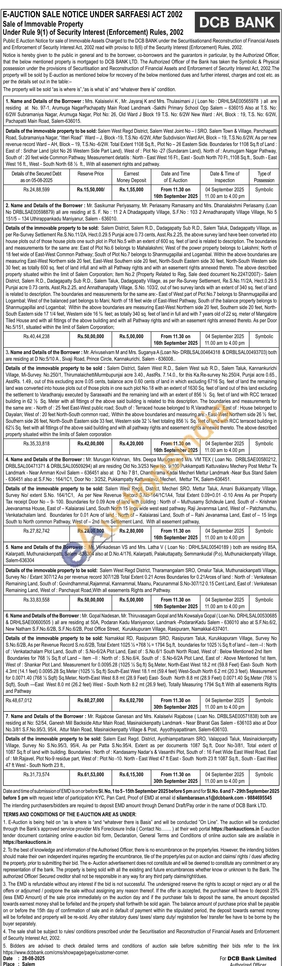 Details of the immovable property to be sold: Salem District, Salem West R.D., Salem West sub R.D., Salem Taluk, Kannankurichi Village, Mi-Survey. No. 250/1, Thirumalaichetti Murmbupunjai acre 3.40., AsstRs. 7.14.0., for this Ka.Re-survey No.250/4, Punjai acre 0.65.. AsstRs. 1.49., out of this excluding acre 0.05 cents, balance acre 0.60 cents of land in which excluding 6716 Sq. feet of fand the remaining land was converted into house plots out of those plots in one such plot No.18 with an extent of 1630 Sq. feet of land out of this land excluding the settlement to Varadharaju executed by Saraswathi and the remaining land with an extent of 856% Sq. feet of land with RCC terraced building in 62% Sq. Meter with all fittings of the above said building is related to this description. The boundaries and measurements for the same are: - North of: 25 feet East-West public road; South of: Terraced house belonged to R.Varadharaju; East of: House belonged to Dayalan; West of: 20 feet North-South common road. Within the above boundaries and measuring are:- East-West Northern side 26% feet, Southern side 26 feet, North-South Eastern side 33 feet, Western side 32% feet totaling 856 Sq. feet of land with RCC terraced building in 62% Sq. feet with all fittings of the above said building and with all pathway rights and easement rights annexed thereto. The above described property situated within the limits of Salem corporation