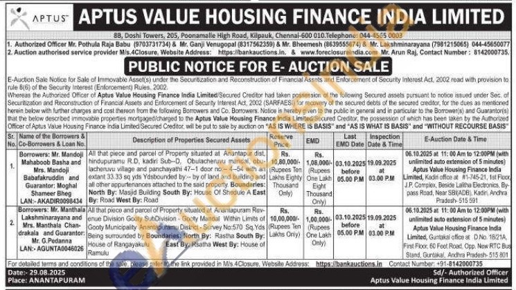 Contact : Authorized Officer Mr. Pothula Raja Babu (9703731734) / Mr. Ganji Venugopal (8317562359) / Mr. Bheemesh (8639555674) / Mr. Lakshminarayana (7981215065) / 044-45650077