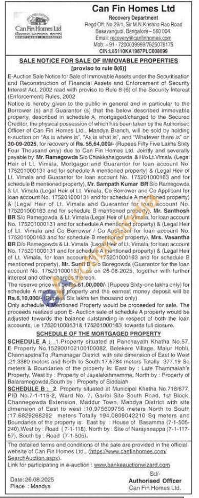SCHEDULE A: 1 Property situated at Panchayath Khatha No.57. E Property No. 152900102100100082, Belekere Village, Malur Hobli, ChannapatnaTq. Ramanagar District with site dimension of East to West 21.3360 meters and North to South 17.6784 meters Totally 377.19 Sq meters & Boundaries of the property is: East by: Late Thammaiah's Property, West by: Property of Jayalakshmamma, North by: Property of Balaramegowda, South by: Property of Siddalah