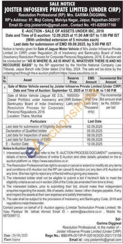 Sale of Motor Vehicle (Jaguar XE 2.0L Diesel Portfolio) under Insolvency and Bankruptcy Board of India (Insolvency Resolution Process for Corporate Persons) Regulations, 2016 Location: Thane, Mumbai