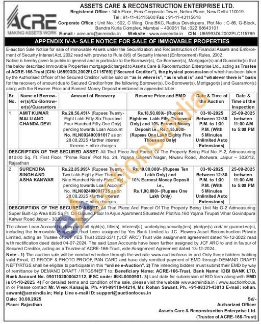 DESCRIPTION OF THE SECURED ASSET: All That Piece And Parcel Of The Property Being Flat No. F-2, Admeasuring 810.00 Sq. Ft. First Floor, "Prime Rose" Plot No. 24, Yojana Ganesh Nagar, Niwaru Road, Jhotwara, Jaipur - 302012. Rajasthan