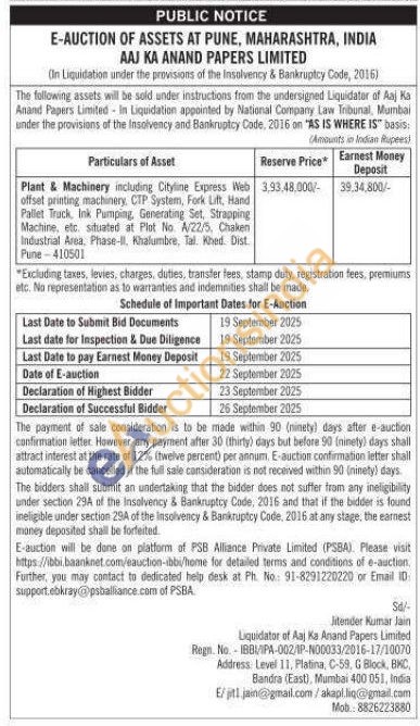 Plant & Machinery including Cityline Express Web offset printing machinery, CTP System, Fork Lift, Hand Pallet Truck, Ink Pumping, Generating Set, Strapping Machine, etc. situated at Plot No A/22/5, Chaken Industrial Area, Phase-II. Khalumbre, Tal. Khed. Dist Pune-410501