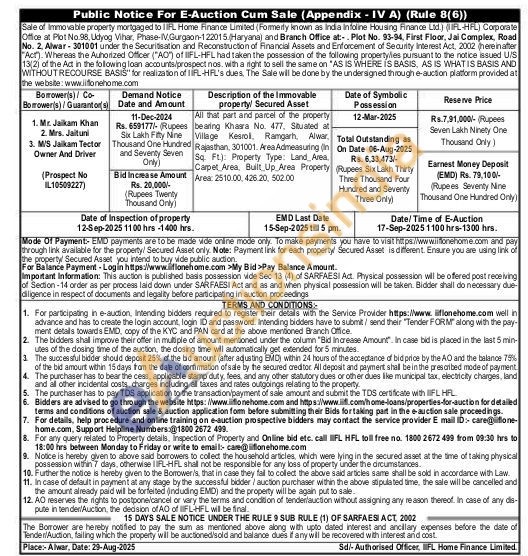 All that part and parcel of the property bearing Khasra No. 477. Situated at Village Kesroll. Ramgarh Alwar. Rajasthan, 301001. Area Admeasuring (In Sq. Ft) Property Type: Land Area Carpet Area, Built Up Area Property Area: 2510.00, 426.20, 502.00