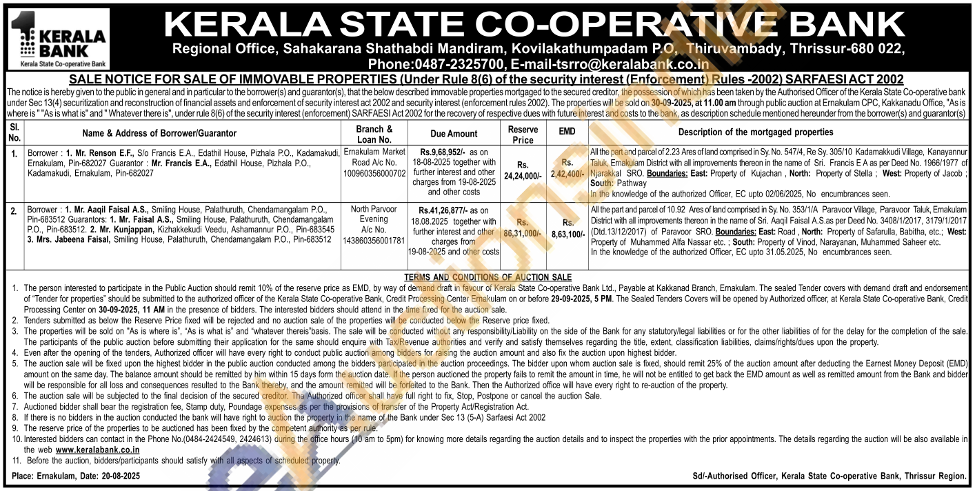 All the part and parcel of 10.92 Ares of land comprised in Sy. No. 353/1/A Paravoor Village, Paravoor Taluk, Emakulam District with all improvements thereon in the name of Sri. Aaqil Faisal AS as per Deed No. 3408/1/2017, 3179/1/2017 (Dtd. 13/12/2017) of Paravoor SRO. Boundaries: East: Road, North: Property of Safarulla, Babitha, etc.; West: Property of Muhammed Alla Nassar etc. South: Property of Vinod, Narayanan, Muhammed Saheer etc. In the knowledge of the authorized Officer, EC upto 31.05.2025, No No encumbrances seen