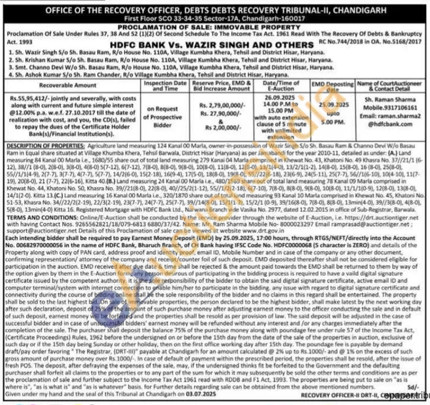 Agriculture land measuring 124 Kanal 00 Marla, owner-in-possession of Wazir Singh 5/o Sh. Basau Ram & Channo Devi W/o Basau Ram in Equal share situated at Village Khumba Khera, Tehsil Barwala, District Hisar (Haryana) as per Jamabandi for the year 2010-11, detailed as under: (A.) Land measuring 84 Kanal 00 Marla ie., 1680/55 share out of total land measuring 279 Kanai 04 Marla comprised in Khewat No. 43, Khatoni No. 49 Khasra No. 37//21/1 (6 12), 38//1 (8-0), 2(8-0), 3(8-0), 4(8-0) 5(7-12), 6(7-12), 7(8-0), 8(8-0), 9(8-0), 10(8-0), 11(8-0), 12(8-0), 13/1(4-0), 13/2/1(1-2), 14(8-0), 15(8-0), 16 (8-0), 25(8-0), 55//1/1(4-9), 2(7-7), 3(7-7), 4(7-7), 5(7-7), 14/2(6-0), 15(2-18), 16(9-4), 17(5-0), 18(8-0), 19(8-0), 55//22(6-18), 23(6-9), 24(5-11), 25(7-7), 56//1(6-10), 10(4-10), 11(7-19), 20(8-0), 21 (7-7), 22(6-16), Kitta 40.(B.) Land measuring 24 Kanal 00 Marla i.e., 480/1569 share out of total land measuring 78 Kanal 09 María comprised in Khewat No. 44, Khatoni No. 50, Khasra No. 39//21(8-0), 22(8-0), 40//25/2(1-12), 55//1/2(2-18), 6(7-10), 7(8-0), 8(8-0), 9(8-0), 10(8-0), 11/1/1(0-9), 12(8-0), 13(8-0), 14/1(2-0). Kitta 13.(C.) Land measuring 16 Kanal 00 Marla ie, 320/1870 share out of total land measuring 93 Kanal 10 Marla comprised in Khewat No. 45, Khatoni No. 51-53, Khasra No. 34//22/2(2-19), 22/3(2-19), 23(7-7), 24(7-7), 25(7-7), 39//14(8-0), 15/1(1-2), 15/2/1 (0-9), 39/16(8-0), 7(8-0), 8(3-0), 13min(4-0), 39//3(8-0), 4(8-1, 5(8-0), 13min(4-0) Kitta 16. Registered Mortgage with HDFC Bank Ltd., Narwana Branch vide Vasika No. 2977, dated 12.02.2015 in office of Sub-Registrar, Barwala