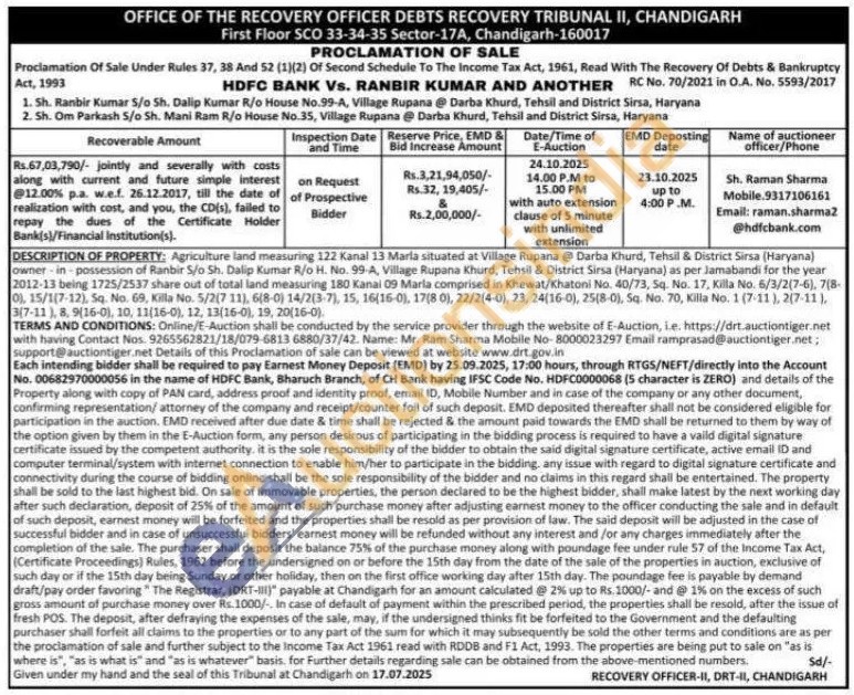 Agriculture land measuring 122 Kanal 13 Marla situated at Village Rupana Darba Khurd, Tehsil & District Sirsa (Haryana) owner in possession of Ranbir S/o Sh. Dalip Kumar R/o H. No. 99-A, Village Rupana Khurd, Tehsil & District Sirsa (Haryana) as per lamabandi for the year 2012-13 being 1725/2537 share out of total land measuring 180 Kanai 09 Marla comprised in Khewat/Khatoni No. 40/73, 5q. No. 17, Killa No. 6/3/2(7-6), 718-0), 15/1(7-12), Sq. No. 69, Killa No. 5/2(711), 6(8-0) 14/2(3-7), 15, 16(16-0), 17(80), 22/2(4-0), 23, 24(16-0), 25(8-0), Sq. No. 70, Killa No. 1 (7-11), 2(7-11), 3(7-11), 8, 9/16-0), 10, 11(16-0), 12, 13(16-0), 19, 20(16-0).