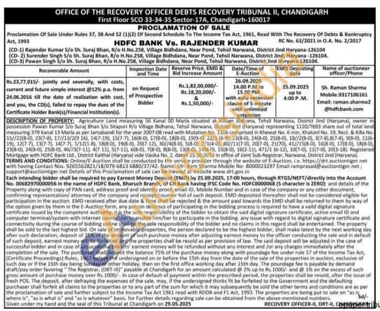 Agriculture Land measuring 56 Kanal 00 Marla situated at Village Bidhana, Tehsil Narwana, District lind (Haryana), owner in possession Pawan Kumar S/o Suraj Bhan S/o Sitapuri R/o Village Bidhana, Tehsil Narwana, District Jind (Haryana) representing 1120/7693 share out of total land measuring 379 Kanal 13 Marla as per Jamabandi for the year 2007-08 read with Mutation No. 1106 comprised in Khewat No. 6 min, Khatoni No. 19, Rect. & Killa No. 15//22(8-0), 23(7-8), 17//13/2(916), 14(7-19), 15(7-7), 16(8-0), 17(8-0), 18(8-0), 19(9-4), 22/1 (6-9), 23(3-0), 24(8-0), 25(8-0), 18//2(8-0), 3(7-8),8(7-8), 9(8-0), 11(6-19), 12(7-7), 13(7-7), 14(7-7), 1/12(1-8), 18(8-0), 19(8-0), 20(7-12), 30//4(8-0), 5(8-0), 7/1(4-0), 40//11(7-0), 20(7-0), 21(70), 41//15(8-0), 16(8-0), 17(8-0), 18(8-0), 23(8-0), 24(8-0), 25(8-0), 46//3(7-11), 4(711), 5(7-11), 6(8-0), 7(8-0), 8(8-0), 13(8-0), 14(8-0), 15(8-0), 16(2-11), 471/1 (6-12), 10(7-0), 11(7-0), 20(3-18). Registered Mortgage with HDFC Bank Ltd., District Kaithal (Haryana) vide Vasika No. 2, dated 25.10.2013 in office of Joint Sub-Registrar, Narwana, District Jind (Haryana). TERMS AND CONDITIONS: Online/E-Auction shall be conducted by the service provider through the website of E-Auction, ie. https://drt.auctiontiger.net with having Contact Nos. 9265562821/18/079-6813 6880/37/42. Name: Mr. Ram Sharma Mobile No- 8000023297 Email ramprasad@auctiontiger.net: support@Pauctiontiger.net Details of this Proclamation of sale can be viewed at website www.drt.gov.in