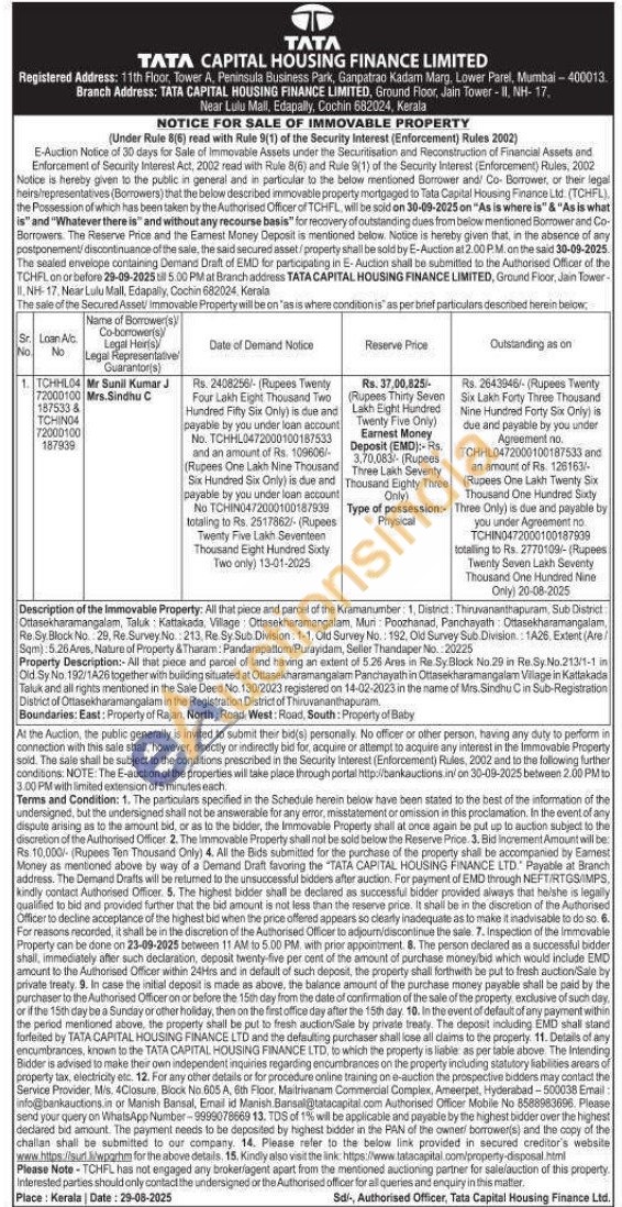Property Description:- All that piece and parcel of land having an extent of 5.26 Ares in Re Sy Block No.29 in Re.Sy. No.213/1-1 in Old Sy No. 192/1A26 together with building situated at Ottasekharamangalam Panchayath in Ottasekharamangalam Village in Kattakada Taluk and all rights mentioned in the Sale Deed No. 130/2023 registered on 14-02-2023 in the name of Mrs. Sindhu C in Sub-Registration District of Ottasekharamangalam in the Registration District of Thiruvananthapuram.