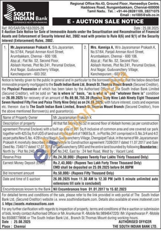 All that flat bearing No.S2 in second floor of Abilash homes (as per construction agreement Perumal Enclave) with a built up area of 901 Sq.ft inclusive of common area and one covered car park together with 425 Sq.ft of UDS of land out of total extent of 1968 Sq.ft., in Plot No.241 comprised in S.No.3/4 and 4/2 as per patta New S.No. 4/2B in Arul Nagar, Guduvancherry Village, Chengalpet Taluk, in the name of Mr. Jayaramanan Prakash K morefully described in the schedule to Construction agreement 7339/2017 dated 11.07.2017 and Sale Deed No. 7340/17 dated 17.07.2017 of Guduvancherry SRO and the entire land bounded by following Boundaries: North by: Plot No.240, South by: Plot No.242, East by: 24 feet Road, West by: Vacant Land