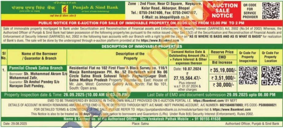 Residential Flat no 102 First Floor A Block Survey no. 116/1 Mauja Bamhangawan PH. No. 52 Bardadeeh ward No 06 Circle Satna Block Sohaval Tehsil Raghurajnagar Distt. Satna Madhya Pradesh Property Boundaries: East: House of Mr. Jain, West: Common Gallery Area, North: Flat No 101, South: Open area