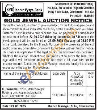 Karur Vysya Bank Gold Auctions Auction in Coimbatore